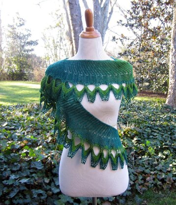 Carolyn's Lace is a crescent-shaped shawl or scarf made with one Schoppel Laceball. It is worked from side to side for the body, and the laciest part is worked back and forth in rows when the top part is finished. Short rows give the wrap its curved shape.