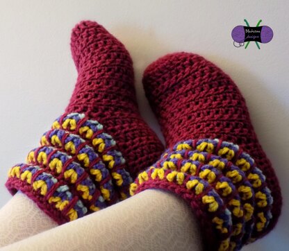 These slippers feature fun color work and an ankle ribbing that makes them look like slouch socks! How cool is that? Plus, the ankle height can easily be adjusted so the finished piece fits your taste!