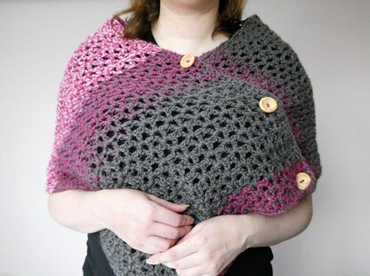 Cosy and warm you can make this wrap in any chunky yarn, the three buttons mean that it can be worn in a variety of ways and the open nature of the fabric means no buttonholes are required!