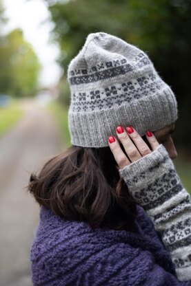 The beanie, mitts and armwarmers all use the same simple fairisle patterns that were used in the sweater designs.