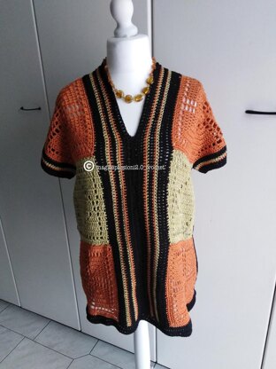 Prendendo spunto da alcuni modelli visti sul web con questa costruzione a pannelli, volendo inserire il granny ma senza, esagerare per renderlo più conforme alla mia fisicità ho pensato a questo modello formato da due strisce unite al centro formate da piastrelle granny e un bordo con colori a contrasto