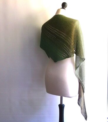 This one skein pattern uses stocking stitch, garter stitch and a simple eyelet pattern to create a boomerang shaped shawl.