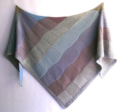 This triangle shawl starts with a square, then stitches are cast on after repeats, to increase the number of squares in a row. After completing the main body, stitches are picked up along the top edge/wingspan to work garter triangles. Finally a garter border is worked to finish the garment.