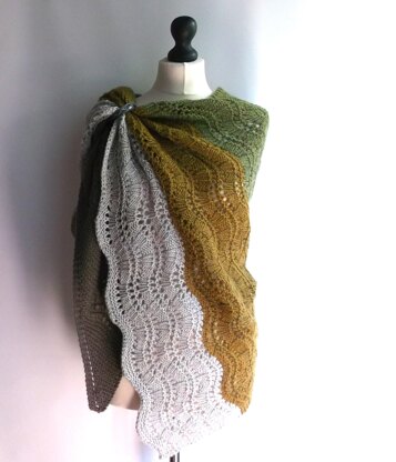 This slightly asymmetric triangle shawl mixes feather and fan pattern, with a 3x3 rib pattern. Worked sideways, with yarn over increases at one edge.