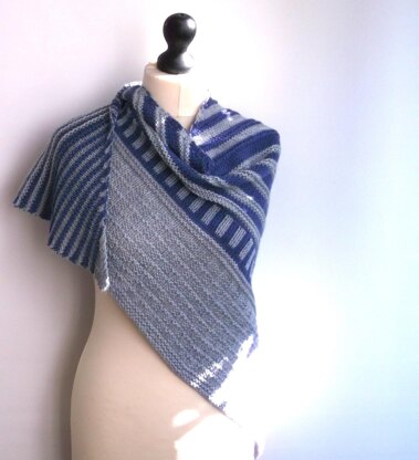 Worked sideways, with yarn over and knit in front and back increases. This attractive shawl has stocking stitch and reverse stocking stitch bands, that get wider as you progress through the pattern. A simple band of one row, one color stripes in the opposite direction, are followed by an interrupted rib border.