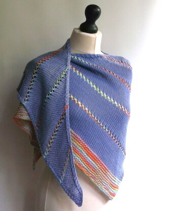 This pretty asymmetrical triangle shawl is worked sideways, in stocking stitch, with an eyelet pattern.