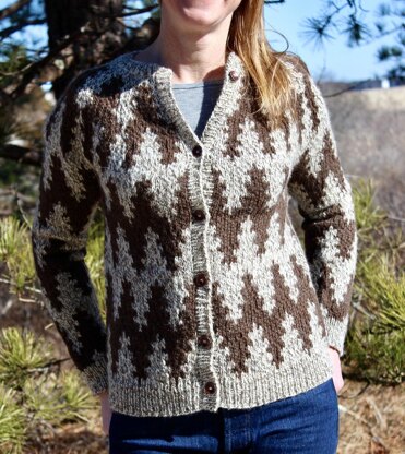 This cardigan is warm, comfy and flattering. It has a bold pattern inspired by pine trees growing up the side of a mountain. Great for beginning and experienced color work knitters!