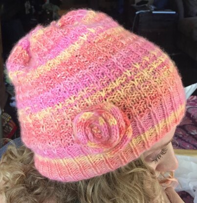 A perfect pattern for that skein of “special” yarn. Slightly slouchy but not overpowering this will become a wardrobe staple. The optional knitted rose embellishment adds a fun touch.