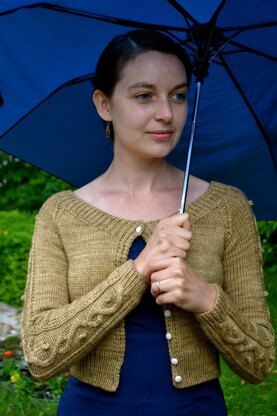 This fitted cropped cardigan is designed to be worn over a pretty dress, but could also dress up jeans and a simple top. The cardigan is worked seamlessly from the bottom up with a wide ribbed hem, raglan shaping and a cable that winds up both sleeves.