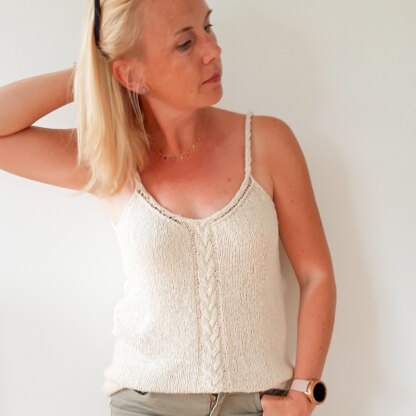 The Cassis sleeveless top is knit from the bottom up in the round, with a braid pattern in the center front and back all the way up until the armhole. From that point on, front and back are worked separately, while continuing an alternated form of the braid pattern, with only one twist symmetric to the other side of the neckline. The straps are formed by a twisted cable and sewn onto the corresponding back strap with Kitchener stitch. The armhole edges are formed with an ongoing i-cord. The gauge indicated in the pattern is a guideline, but can divert by a few stitches without affecting too much the pattern and shape. The form is fitted, but the textures used tend to ease up after washing, making it wider.