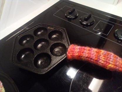 The biggest drawback to cast iron cookery is the handle heating up along with the pan. Luckily, handles are pretty standard in size, so here’s a pattern for a wool cover that makes it much easier to move the pan. Enjoy!
