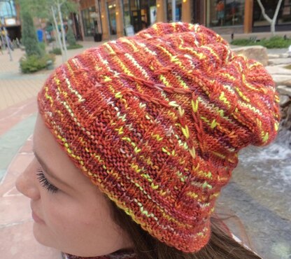 This hat (as well as the cowl and fingerless mitts) was based on my design for Castle Walls Socks. The socks were designed to look like a castle. The hat has a castle door and a brick pattern for the hat body, and garter rib at the brim and top.