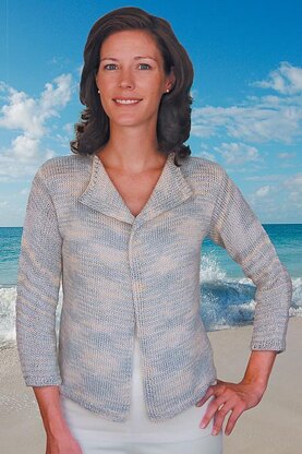 This very easy cardigan, with three-quarter length sleeves, is light as a feather and a delight to wear on spring days or cool evenings. The draped front overlaps slightly or may be closed with your favorite pin.