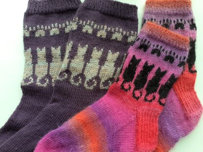 Celebrate your feline friends with a cute and comfy pair of cat socks. This pattern describes how to make a pair of cuff down socks with a slipped stitch heel flap construction, but it could easily be adjusted to toe up or a different heel construction.