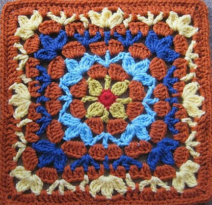 I love to adapt to crochet the forms and styling of other art media, this from ceramic tiles. This afghan block is repetitive and easy to stitch with striking results.