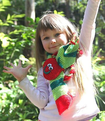 A cute caterpillar to wrap around your neck – plenty long enough for an adult as well as a child. Looks great in all sorts of colours. One of a series of scarves for children (and adults with a quirky sense of humour!). All have a head with a mouth that you can thread the tail through. This pattern includes instructions on how to make an i-cord.