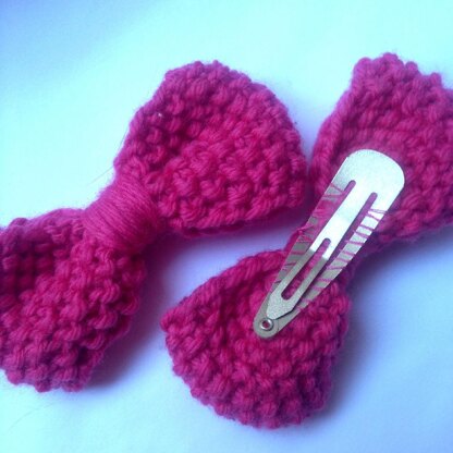 The pink bow pictured is made of Knit Picks Wool of the Andes, the blue bow is a worsted weight cotton. Whatever you choose to knit these with, these knit up quickly using very little yarn (about 20 yards) and are my go-to for quick gifts and outfit accessories.