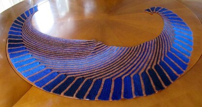 Cate's Wrap is a tribute to the beautiful, knitted design, Nymphalidea by Melinda VerMeer. It is worked in two lace weight yarns--one with gradual color changes, and the other in a sharply contrasting color. The yarns are not cut but are carried up the side. Cate's Wrap is worked like a triangle with short rows along one side. The short rows curve the wrap and gradually form it into a crescent shape.