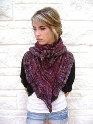 Stockinette stitch brings out the lovely colors and a simple eyelet row and soft ruffles add interest. The garter stitch border rounds out this simply elegant shawl.