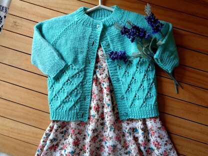 Catherine Baby Cardigan is a lovely spring lace baby cardigan, must-to-have in all baby girls closets, the romantic lace panels make this garment so delicate and perfect that little spring dress, construction is raglan seamless and quick to knit, pattern include many sizes