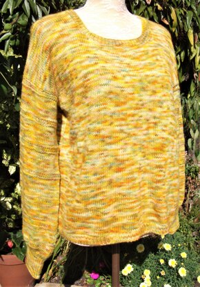 A gorgeous sweater for all seasons - easy knit and easy fit. The back and front are in stocking stitch with narrow borders of 1/1 rib. The sleeves are worked top down and are a wide fit, they are cinched into the ribbed cuff to give a lovely soft look. A larger needle is used for one of the rows on the sleeve pattern bands to create horizontal “stripes”.