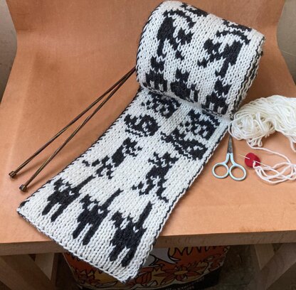 This long, skinny cat themed scarf is knit using the double knitting technique, the finished piece is double sided and double thickness, a bit like two separate pieces being sewn together back to back, stocking/stockinette stitch is uppermost on both sides with the colours reversed on the ‘wrong side’ - although you end up with two right sides! The two sides or layers are knit at the same time by first knitting a stitch from the side facing you and then purling a stitch from the opposite side. If you have not used this technique before all will become clear as you go.