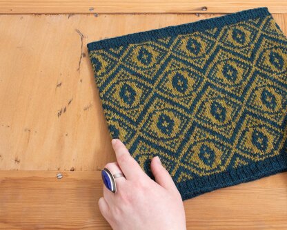 My two beautiful felines like to keep close tabs on me, lifting their heads from a nap, with green eyes gleaming, to check whether I might be headed for the kitchen. The Cat’s Eye Cowl is a short, cosy cowl featuring bold colourwork inspired by the magical eyes of cats. The pattern includes two height options, and the circumference can be altered by working a different number of repeats.