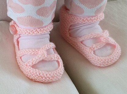 These 4ply garter stitch baby sandals have a buttoned ankle strap and linked toe straps. This style of sandal is also available in 3ply and 8ply.