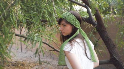 This lacy, ethereal headscarf is inspired by Celebi, the legendary Pokémon known as the Guardian of the Forest. Celebi is reminiscent of a tiny woodland fairy, which inspired the boho-chic, woodsy feel of this scarf. Its lacy chevron stitch is fully reversible and lies flat due to the garter stitch background. The scarf can also be easily adapted to suit your preferences, as three size options are included in the pattern.