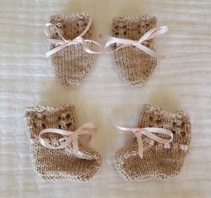 This 8ply Bootie and Mitten set is worked in a lovely but simple lace pattern for the top edges, then stocking stitch for the remainder. Easy and quick to knit, they will make a perfect present for a new baby.