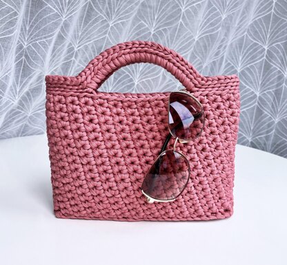 MATERIALS: The bag is made with 5-6 mm thick t-shirt yarn in dusky pink color, using a 8 mm crochet hook. You’ll need 219–273 yards (200–250 m), depending on the hook size and your personal tension.