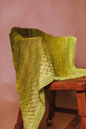There are double garter borders between each section and cabling along the outer edges and down the spine. The shawl is finished off with a nice, rolled, I-cord bind-off.