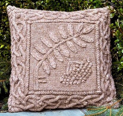 Full text plus charts for the border and center panel. This pattern is written in easy to follow text with special stitches explained. Border is knitted in one long piece while mitering the corners using short rows and with the resulting short ends sewn together. Each leaflet is knitted separately then sewn on. The ancient Celts prized the rowan for its protective properties. This design is one in a series of Celtic botanical knits and this pillow is a companion to the Celtic Oak Pillow. Each few (letter) of the ancient Irish writing called Ogam (pronounced owam) is associated with a sacred tree. The Ogam few called “luis" represents the rowan and is incorporated on this pillow pattern.