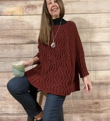 If you love knitting cables, you will really enjoy the Celtic Swoncho! The swoncho is knit in raglan fashion, with increases adjacent to each raglan cable until the sleeve separation. The front and back are worked in an allover cable pattern that gets larger for the length of the swoncho. The sides are worked in Moss Stitch, which gets larger to the sleeve separation, but begins getting smaller after the sleeve separation so that there is no change in circumference after the sleeve separation.