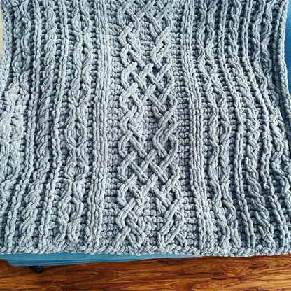 THIS IS A LOOP YARN FINGER-KNITTING PATTERN. The Celtic Tower Cable Blanket features uses only knit, purl and criss-cross stitches to create an impressive 30-row repeat pattern. The centre tower cable motif is bordered by X and O cables, flat cables and ribbing. UK knitters can substitute Bernat Alize Blanket-EZ yarn for a blanket of approximately the same size - you will only need 5 skeins.