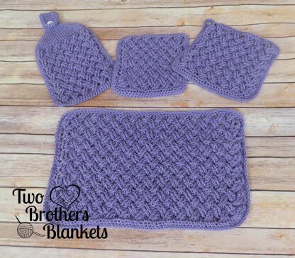 The Celtic Weave Kitchen Set comes with instructions for 4 pieces: a dish towel, dish cloth, hot pad, and placemat. All four pieces include the celtic weave stitch to make a beautiful matching kitchen set!