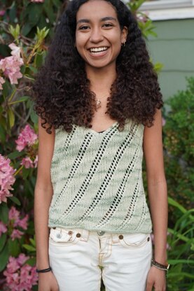 Cerith is a super cute tank top with diagonal lines of eyelets on a background of ribbing. The stitch pattern is very easy to memorize as you are simply following a diagonal line. The construction is bottom-up, beginning with a provisional cast on. The body is worked in the round to the underarms and then the front and back are worked back and forth in rows. The only finishing is a simple three-row edging at the bottom, picked up from the provisional cast on and grafting of the shoulder straps.