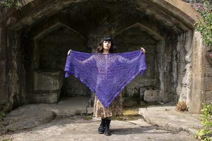 Cerridwen is a traditional triangle shawl, knit from the top down, which features seven different Shetland, Victorian, and contemporary lace stitches that blend meticulously from one to the next, including a subtle ruffle along the bottom hem. While resplendent in just one hue, each section can also be striped with a variety of colors to create a more dynamic and modern piece.