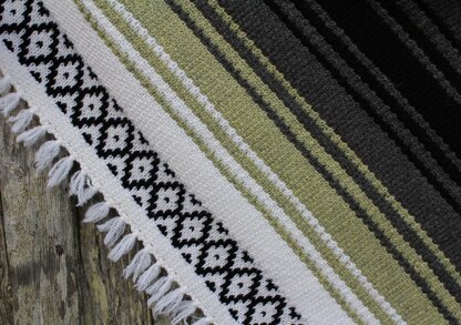 Knit from side to side in linen stitch and stranded stockinette. One side is fringed, the other is embellished with blanket stitch.