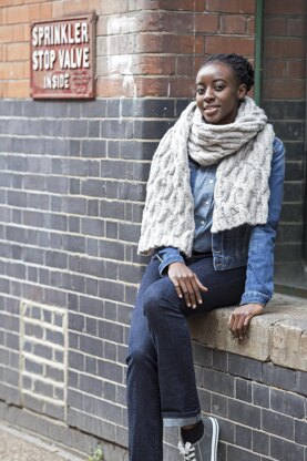 This wonderfully cosy wrap with its giant-sized linked chain cables is knitted in Rowan Brushed Fleece, and knits up quickly.