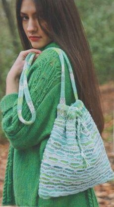 This is a pattern for a chain stitch bag, originally published in Knitting magazine. It has a slip stitch chain stitch using a varigated and solid yarn, 2 x 2 rib edges and a stocking stitch strap. It closes with a tie and eyelets, and has lining and wadding. Photos Knitting magazine.