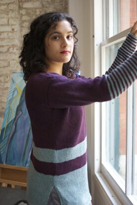 The sample shown was knit in Louet Euroflax Sport, shades Eggplant and Aqua.