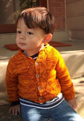 A cozy cardigan perfect for boys and girls alike. Knit in DK weight to create the perfect layer to fend off fall's chill. Simple cables frame the button bands and decorate the waistline. The body is knit in one piece from the top down, so it's nearly seamless, and a simple rolled collar finishes it off.