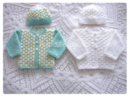 Requirements for green and white versions in 1st photo 3.25mm and 4mm knitting needles 110g DK for all one colour ( white version ) 50g green DK 40g white DK 20g lemon DK