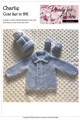 Pattern includes Double Breasted Coat, Pull On Hat and T Bar Shoes in a textured pattern with a single cable. Unisex design with instructions for buttonholes on both sides. 6 buttons required for Coat and 2 for Shoes. Optional knitted facings for front edges. 0-3m knitted with 3.00mm & 3.50mm needles. 0-6m knitted with 3.25mm & 4.00mm needles.
