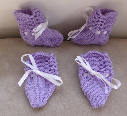 This 8ply Bootie and Mitten set is worked in a feather and fan lace pattern then stocking st. Easy and quick to knit, they will make a perfect welcome present for a new baby.
