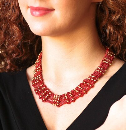 The Charlotte Necklace is a lacy textured design, knit with luxurious Katia Gatsby yarn, adorned with sparkling glass beads, and fastened with a toggle clasp.