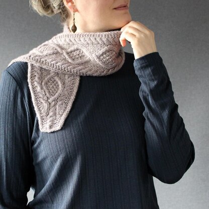 A beautiful cable pattern decorates this little scarf which is a wonderful piece to add to your wardrobe for the transitional seasons.