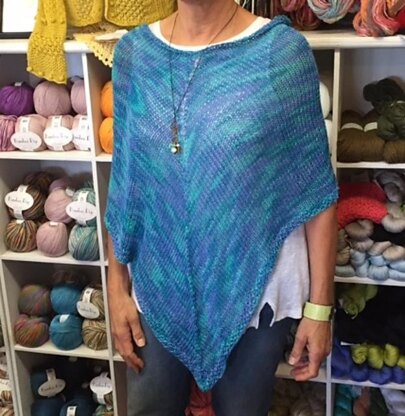 A simple, cute, asymmetrical poncho made from the top down. It can be wore several ways, #1 with the point in the front, #2 with the point off to one side of the front, #3 with the point at the back (I call this one the Audrey Hepburn way), #4 with the point off of one shoulder (not shown). Knitted at a loose gauge makes this a quick project.