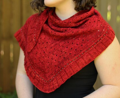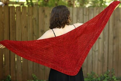Charmed is a top-down triangle with extra edge increases on the wrong side to give just a bit of a crescent shape. The body is a textured eyelet stitch and the edging features beads framed by two horizontal braids and a wide ribbed ruffle.